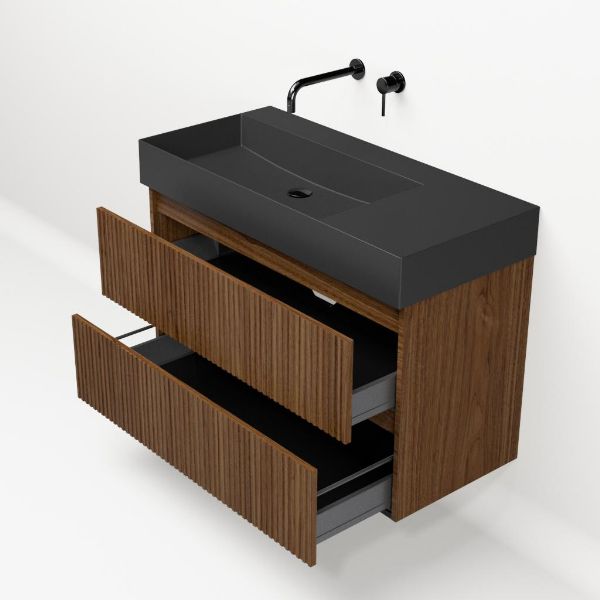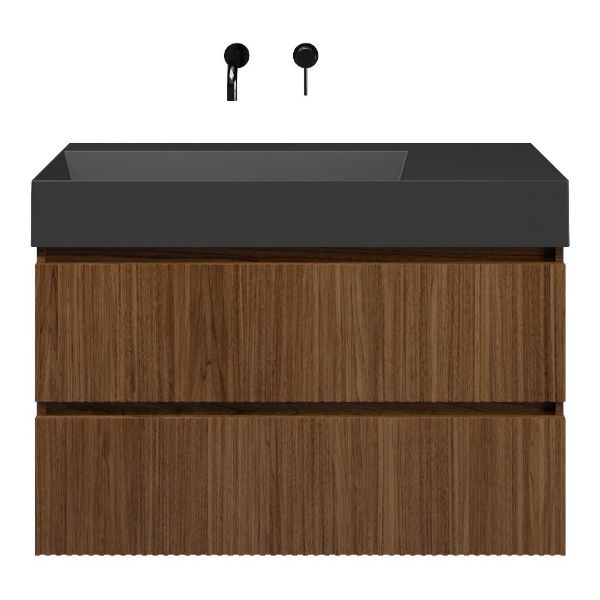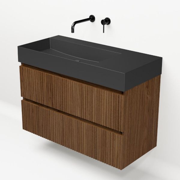 | | Bellanti Silvan/Azzurra badmeubel 100x46 2 softclose laden met ribbel - latjes structuur warm noten greeploos keramische wastafel links antraciet mat zonder kraangaten |