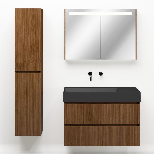 | Bellanti Silvan/Azzurra badmeubel 100x46 2 softclose laden met ribbel - latjes structuur warm noten greeploos keramische wastafel links antraciet mat zonder kraangaten |