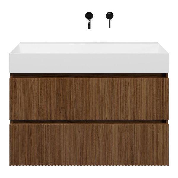 | Bellanti Silvan/Azzurra badmeubel 100x46 2 softclose laden met ribbel - latjes structuur warm noten greeploos keramische wastafel wit glans zonder kraangaten |