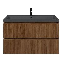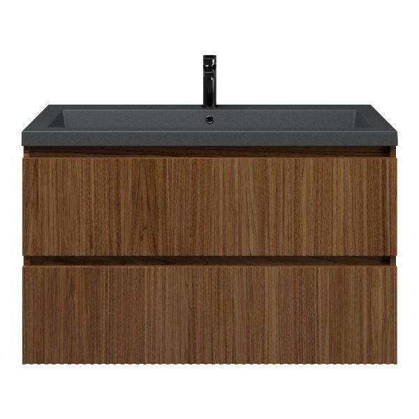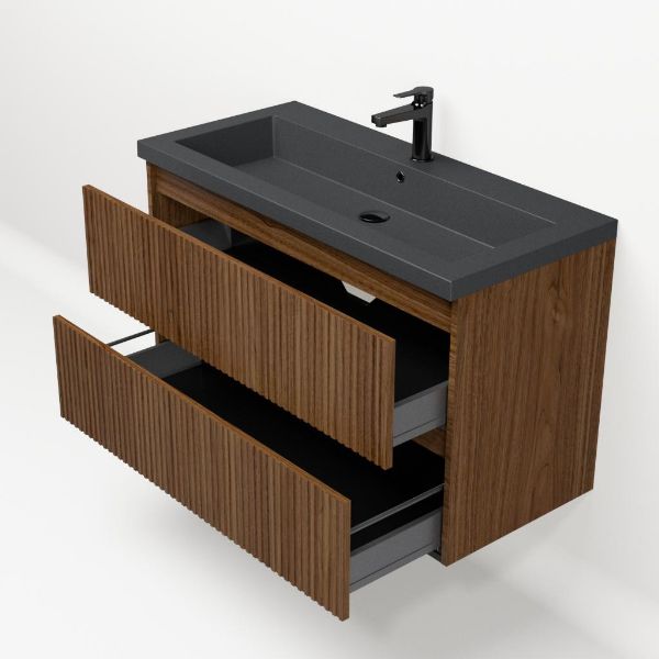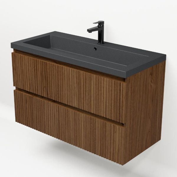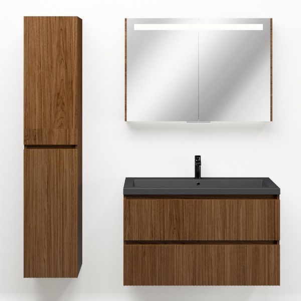 | Bellanti Silvan/Esta-Q badmeubel 100x46 2 softclose laden met ribbel - latjes structuur warm noten greeploos quartz wastafel mat grijs zonder kraangat |