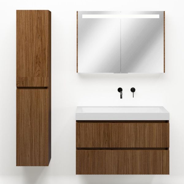 | Bellanti Silvan/Renzo-q badmeubel 100x46 2 softclose laden met ribbel - latjes structuur warm noten greeploos quartz wastafel mat wit zonder kraangaten |