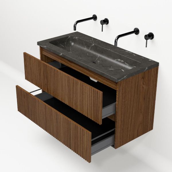 | Bellanti Silvan/Square badmeubel 100x46 2 softclose laden met ribbel - latjes structuur warm noten greeploos natuursteen wastafel blue stone zonder kraangaten |