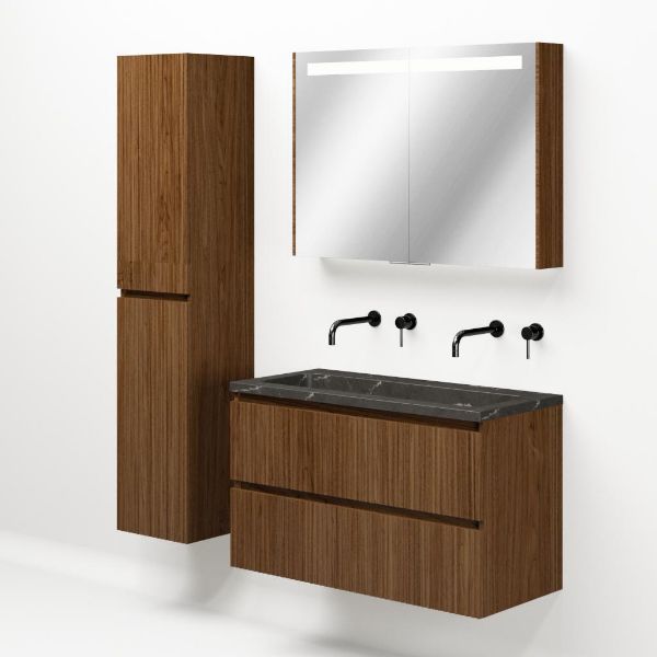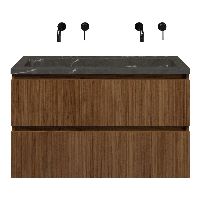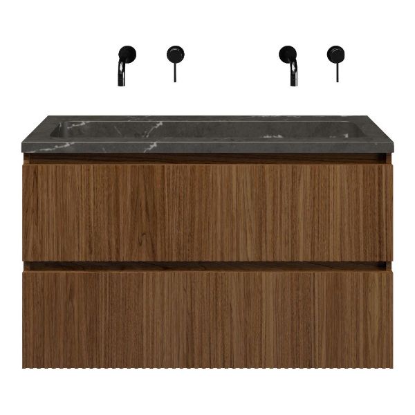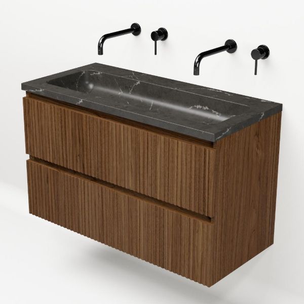 | | Bellanti Silvan/Square badmeubel 100x46 2 softclose laden met ribbel - latjes structuur warm noten greeploos natuursteen wastafel blue stone zonder kraangaten |