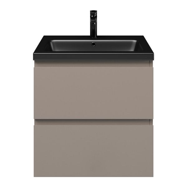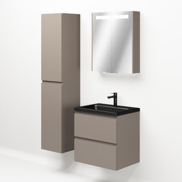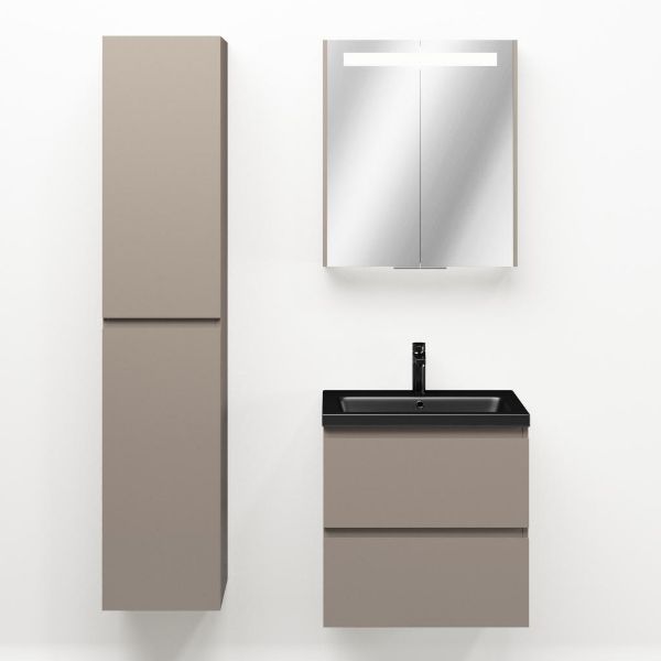 Greeploos badkamermeubel in de kleur taupe is 60 cm breed. De wastafel is vervaardig in keramiek en heeft de kleur zwart mat keramiek. Dit badkamermeubel met deze wastafel is leverbaar tussen de 60 cm t/m 120 cm