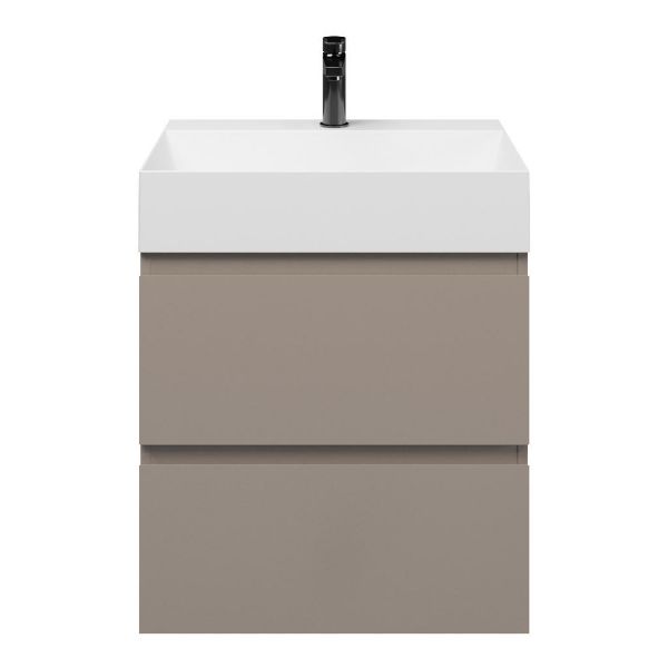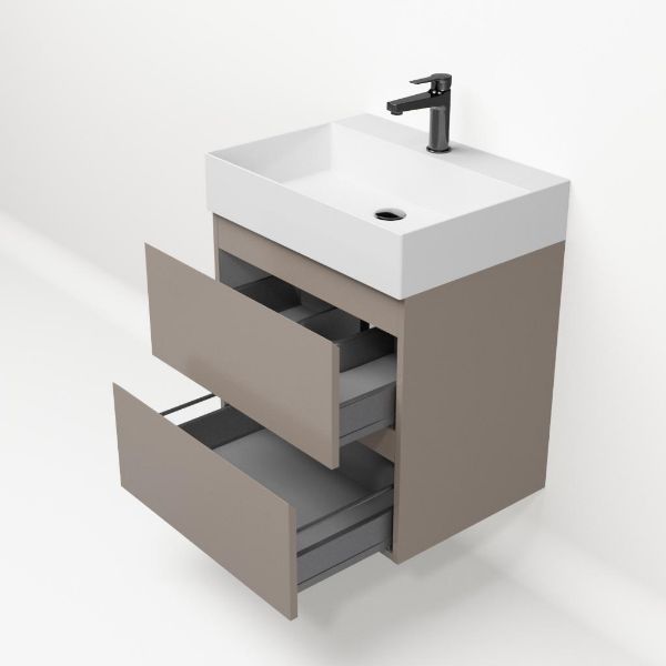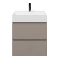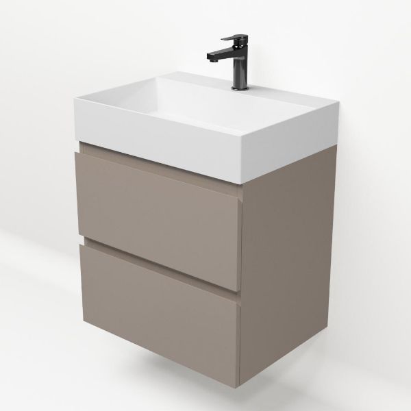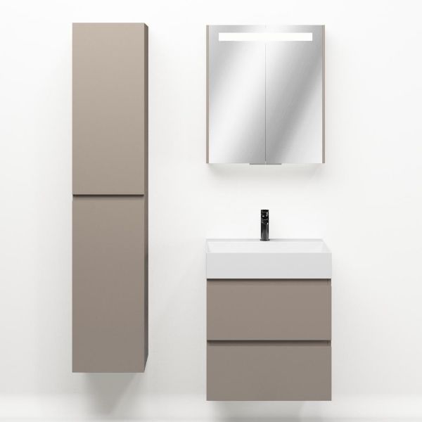 Greeploos badkamermeubel in de kleur taupe is 60 cm breed. De wastafel is vervaardig in keramiek en heeft de kleur wit keramiek. Dit badkamermeubel met deze wastafel is leverbaar tussen de 60 cm t/m 160 cm