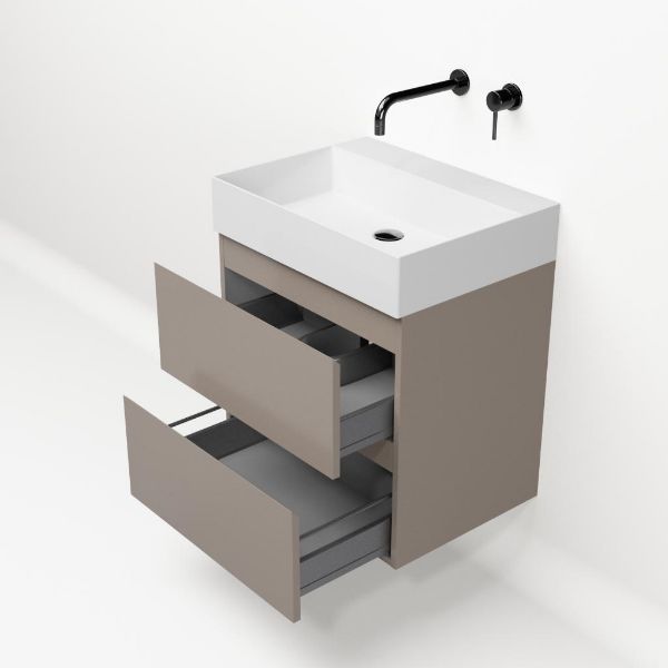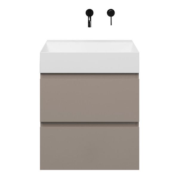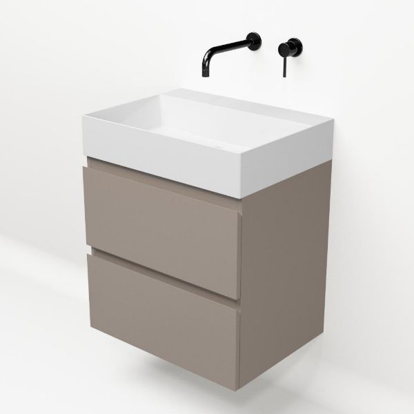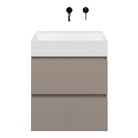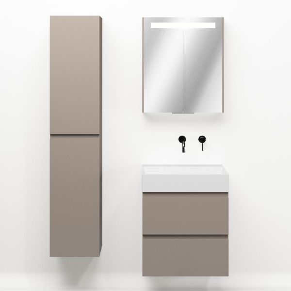 Greeploos badkamermeubel in de kleur taupe is 60 cm breed. De wastafel is vervaardig in keramiek en heeft de kleur wit keramiek. Dit badkamermeubel met deze wastafel is leverbaar tussen de 60 cm t/m 160 cm