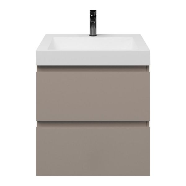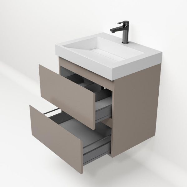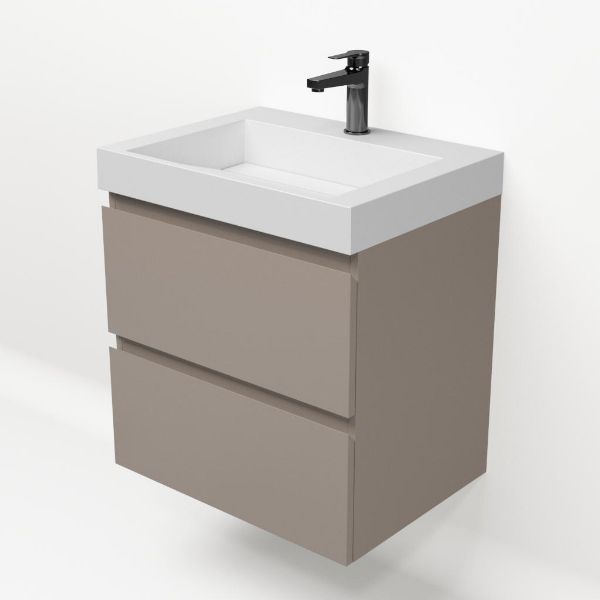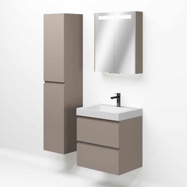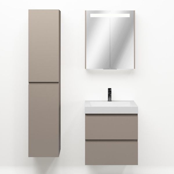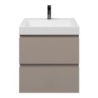 Greeploos badkamermeubel in de kleur taupe is 60 cm breed. De wastafel is vervaardig in quartz en heeft de kleur wit mat keramiek. Dit badkamermeubel met deze wastafel is leverbaar tussen de 60 cm t/m 140 cm