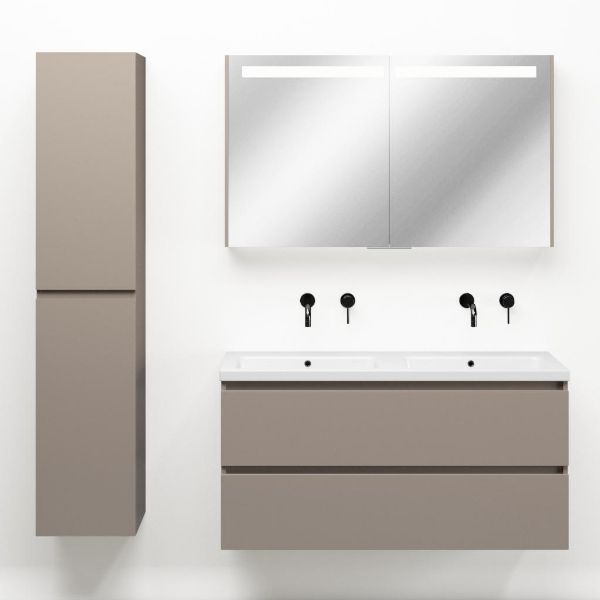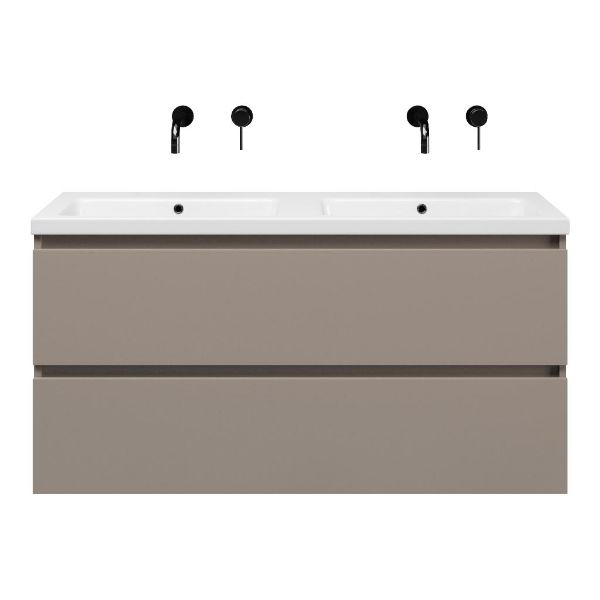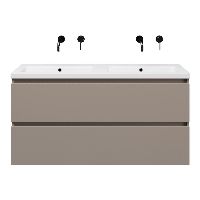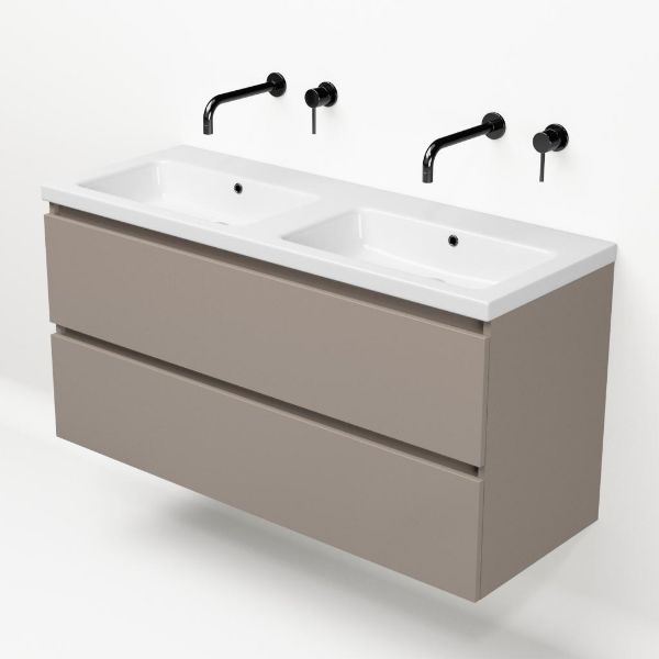 | Bellanti Fiore /Amelia badmeubel 120x46 2 softclose laden taupe greeploos keramische wastafel dubbel wit glans zonder kraangaten |