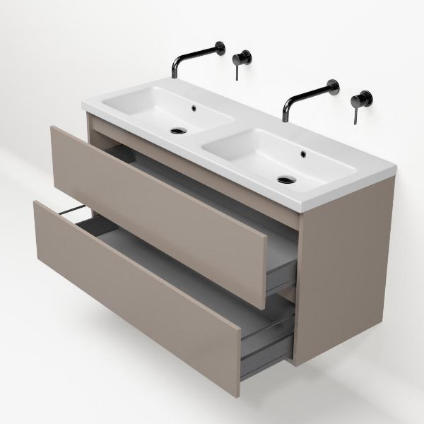 | | Bellanti Fiore /Amelia badmeubel 120x46 2 softclose laden taupe greeploos keramische wastafel dubbel wit mat zonder kraangaten |