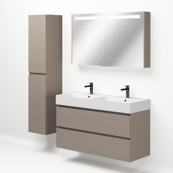 Greeploos badkamermeubel in de kleur taupe is 120 cm breed. De wastafel is vervaardig in keramiek en heeft de kleur wit keramiek.
