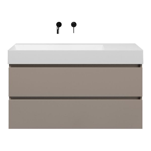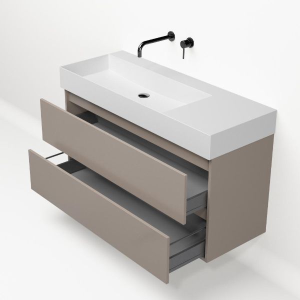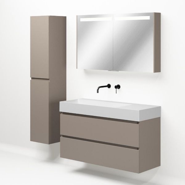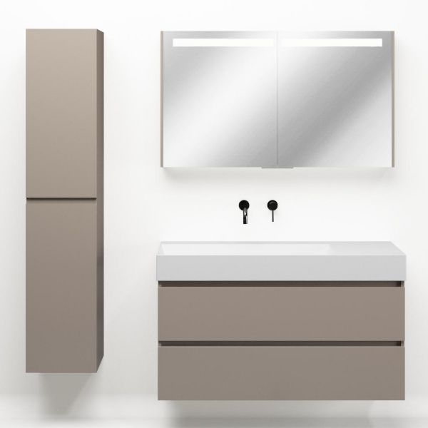 Greeploos badkamermeubel in de kleur taupe is 120 cm breed. De wastafel is vervaardig in keramiek en heeft de kleur wit mat keramiek.