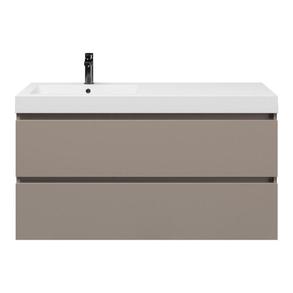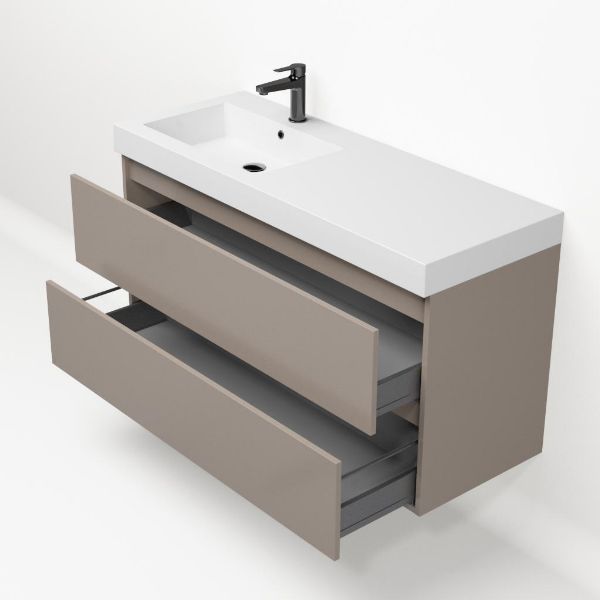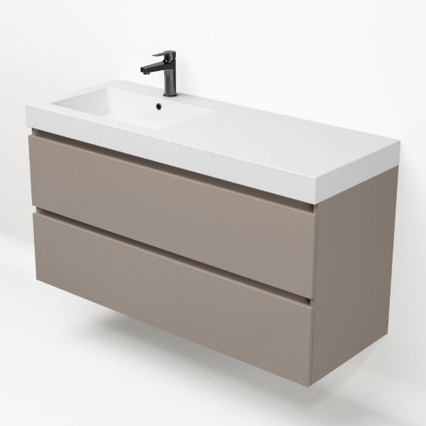 Greeploos badkamermeubel in de kleur taupe is 120 cm breed. De wastafel is vervaardig in polystone en heeft de kleur wit.