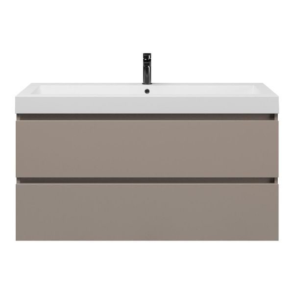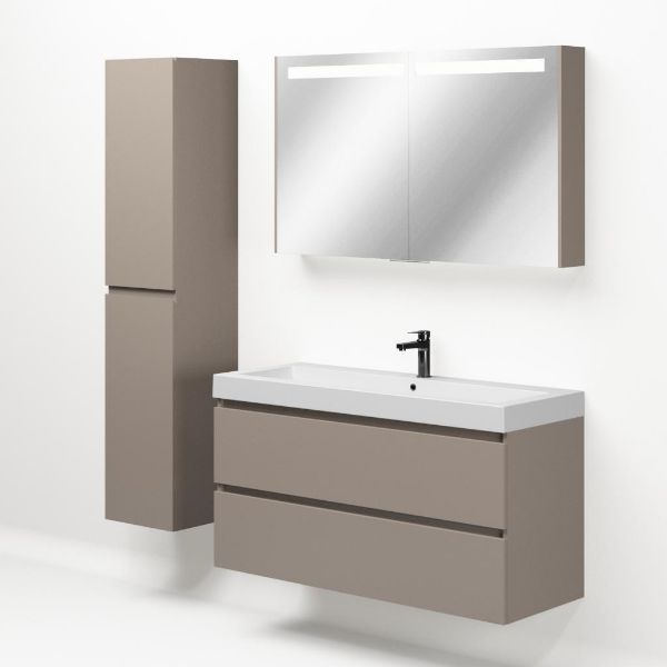 Greeploos badkamermeubel in de kleur taupe is 120 cm breed. De wastafel is vervaardig in quartz en heeft de kleur wit mat quartz.