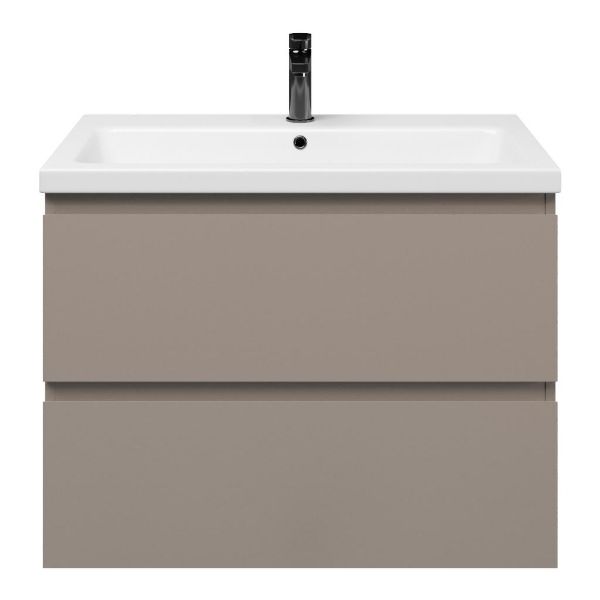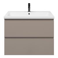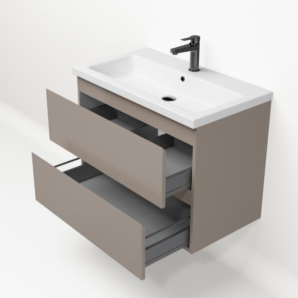 Greeploos badkamermeubel in de kleur taupe is 80 cm breed. De wastafel is vervaardig in keramiek en heeft de kleur wit keramiek. Dit badkamermeubel met deze wastafel is leverbaar tussen de 60 cm t/m 120 cm