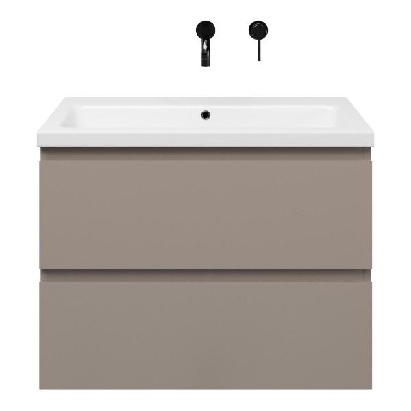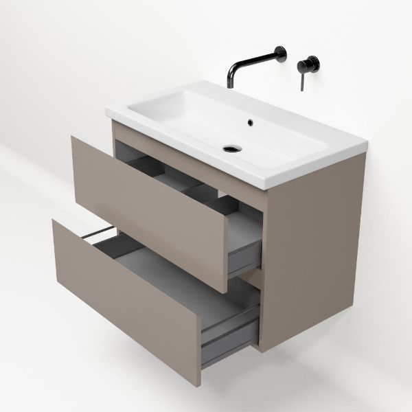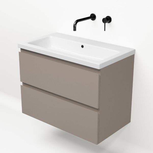 Greeploos badkamermeubel in de kleur taupe is 80 cm breed. De wastafel is vervaardig in keramiek en heeft de kleur wit keramiek. Dit badkamermeubel met deze wastafel is leverbaar tussen de 60 cm t/m 120 cm