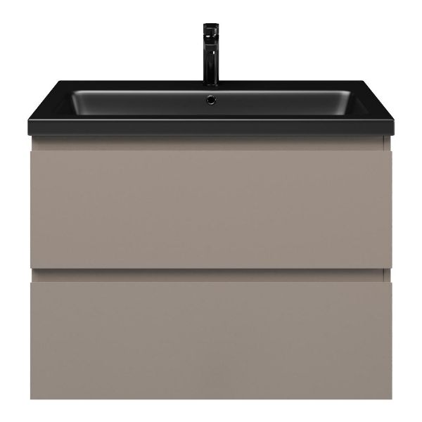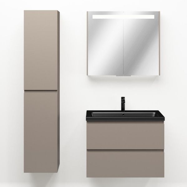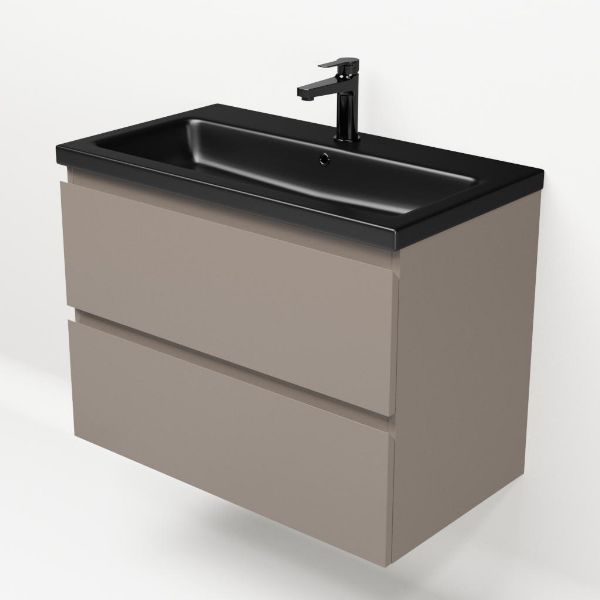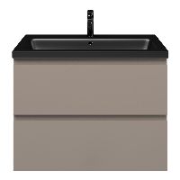 Greeploos badkamermeubel in de kleur taupe is 80 cm breed. De wastafel is vervaardig in keramiek en heeft de kleur zwart mat keramiek. Dit badkamermeubel met deze wastafel is leverbaar tussen de 60 cm t/m 120 cm