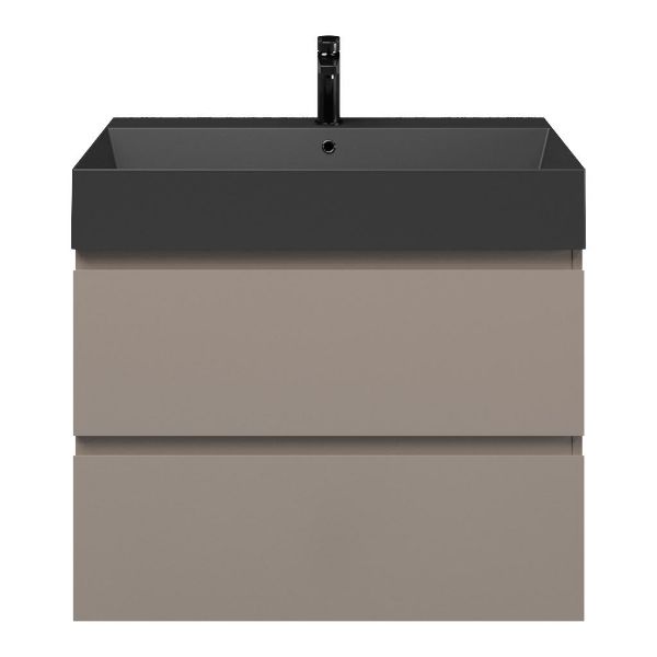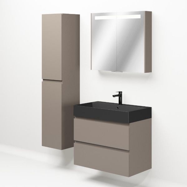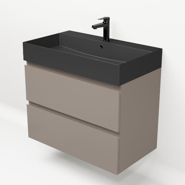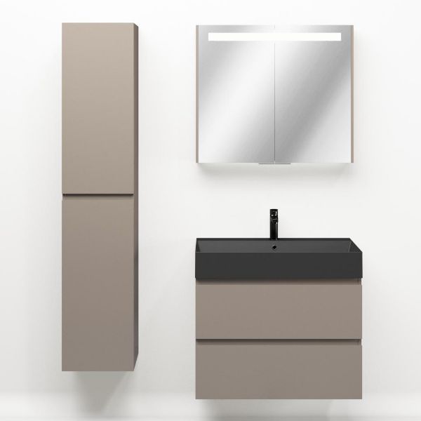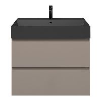 Greeploos badkamermeubel in de kleur taupe is 80 cm breed. De wastafel is vervaardig in keramiek en heeft de kleur antraciet mat keramiek az. Dit badkamermeubel met deze wastafel is leverbaar tussen de 60 cm t/m 160 cm