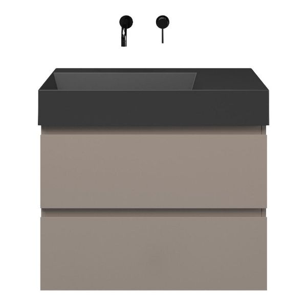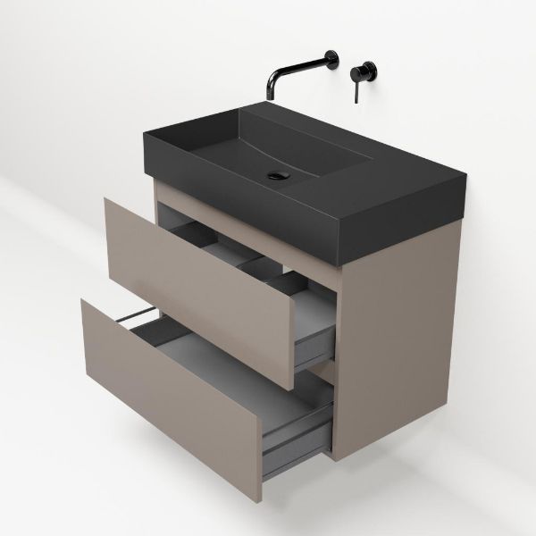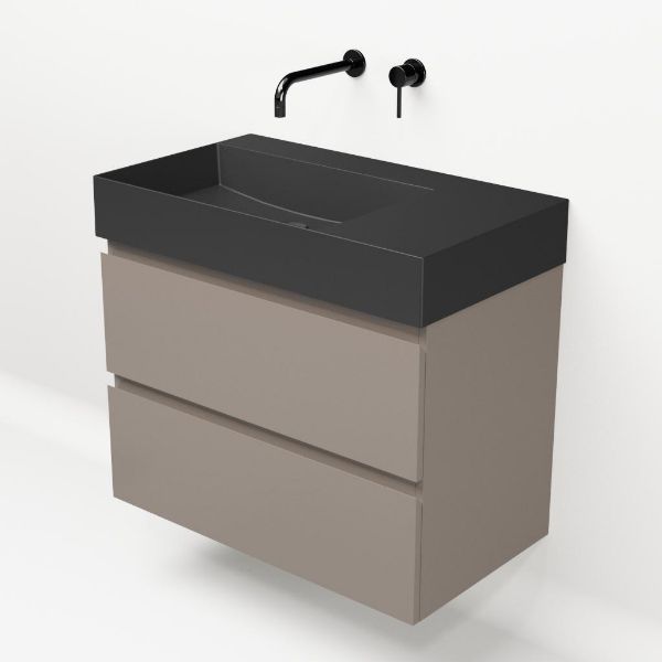 Greeploos badkamermeubel in de kleur taupe is 80 cm breed. De wastafel is vervaardig in keramiek en heeft de kleur antraciet mat keramiek az. Dit badkamermeubel met deze wastafel is leverbaar tussen de 60 cm t/m 160 cm