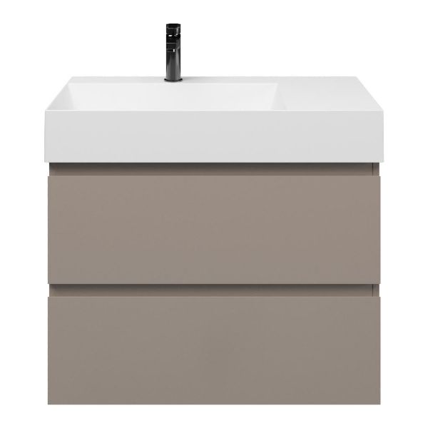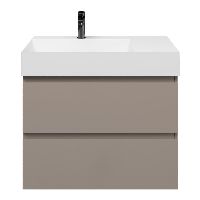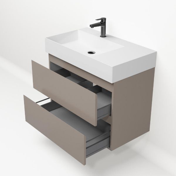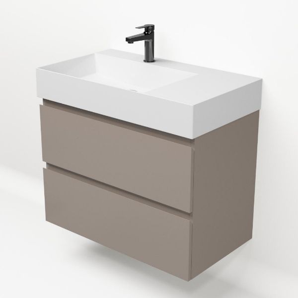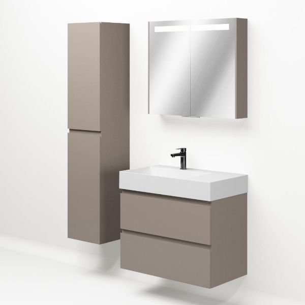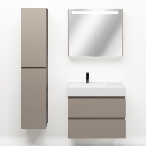 Greeploos badkamermeubel in de kleur taupe is 80 cm breed. De wastafel is vervaardig in keramiek en heeft de kleur wit keramiek. Dit badkamermeubel met deze wastafel is leverbaar tussen de 60 cm t/m 160 cm