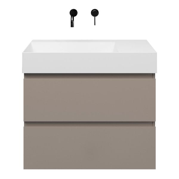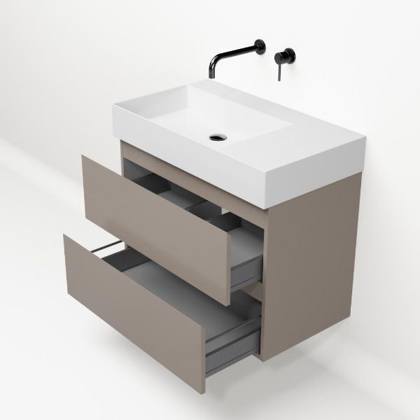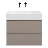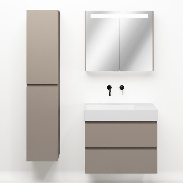 Greeploos badkamermeubel in de kleur taupe is 80 cm breed. De wastafel is vervaardig in keramiek en heeft de kleur wit keramiek. Dit badkamermeubel met deze wastafel is leverbaar tussen de 60 cm t/m 160 cm