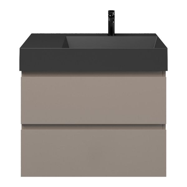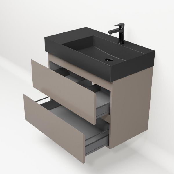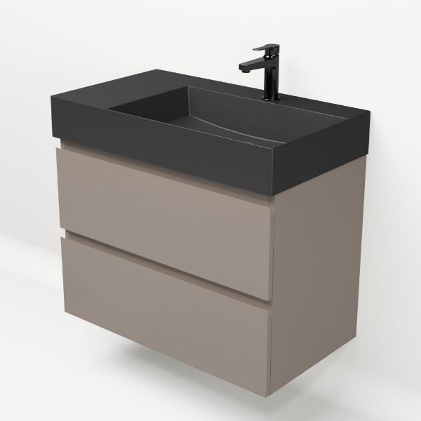 Greeploos badkamermeubel in de kleur taupe is 80 cm breed. De wastafel is vervaardig in keramiek en heeft de kleur antraciet mat keramiek az. Dit badkamermeubel met deze wastafel is leverbaar tussen de 60 cm t/m 160 cm