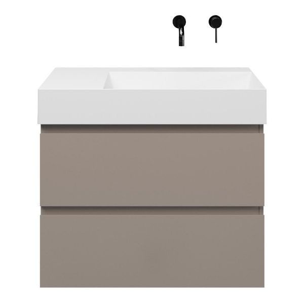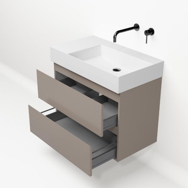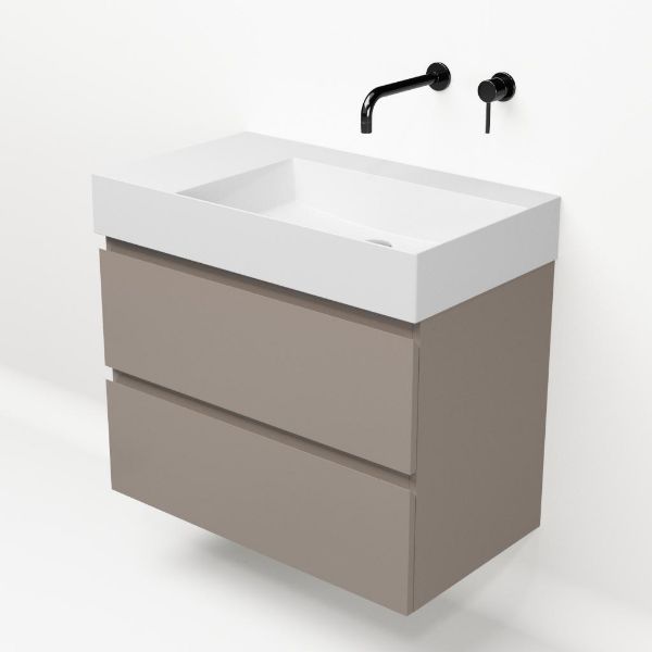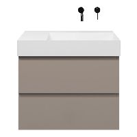 Greeploos badkamermeubel in de kleur taupe is 80 cm breed. De wastafel is vervaardig in keramiek en heeft de kleur wit keramiek. Dit badkamermeubel met deze wastafel is leverbaar tussen de 60 cm t/m 160 cm