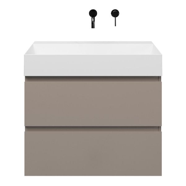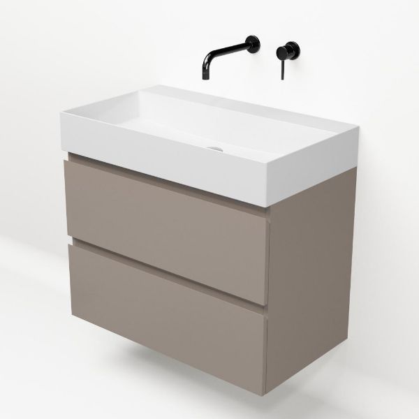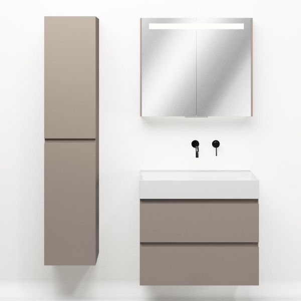 Greeploos badkamermeubel in de kleur taupe is 80 cm breed. De wastafel is vervaardig in keramiek en heeft de kleur wit keramiek. Dit badkamermeubel met deze wastafel is leverbaar tussen de 60 cm t/m 160 cm