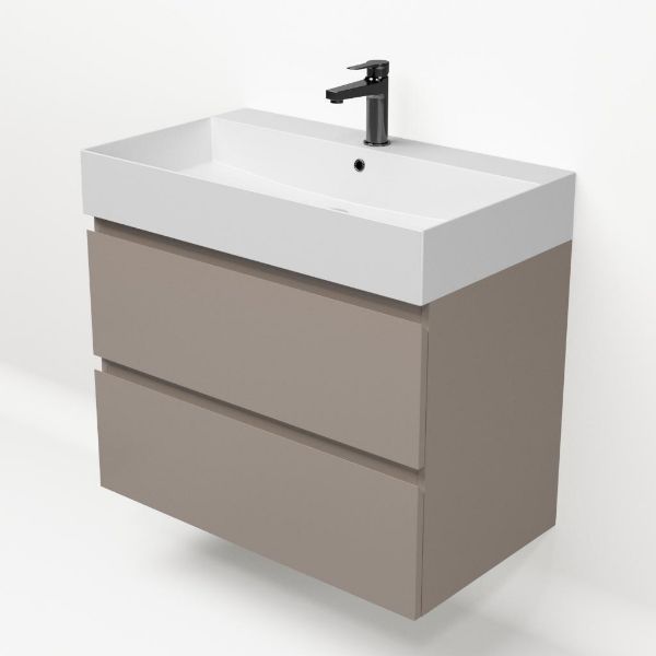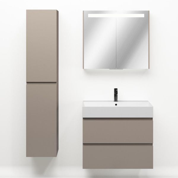 Greeploos badkamermeubel in de kleur taupe is 80 cm breed.  De wastafel is vervaardig in keramiek en heeft de kleur wit mat keramiek. Dit badkamermeubel met deze wastafel is leverbaar tussen de 60 cm t/m 160 cm