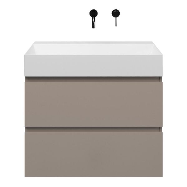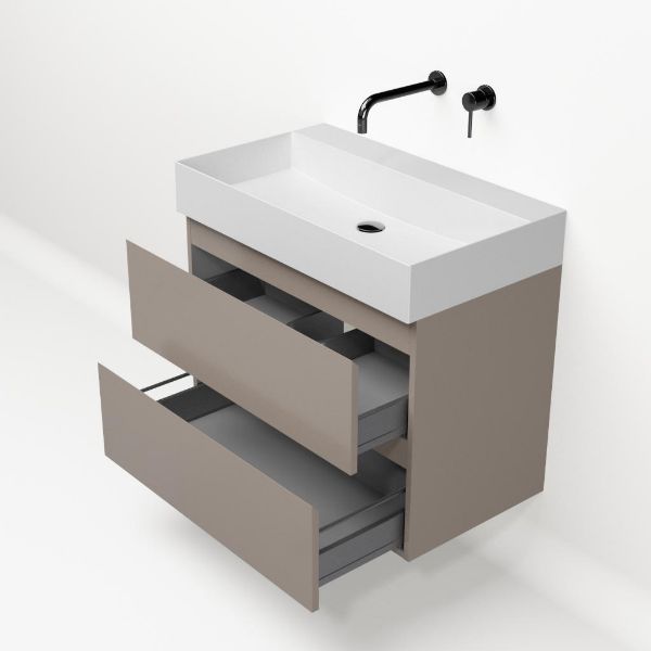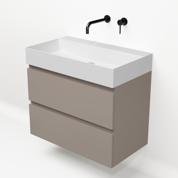 Greeploos badkamermeubel in de kleur taupe is 80 cm breed. De wastafel is vervaardig in keramiek en heeft de kleur wit mat keramiek. Dit badkamermeubel met deze wastafel is leverbaar tussen de 60 cm t/m 160 cm