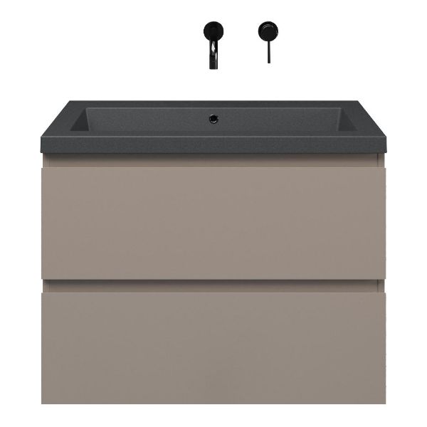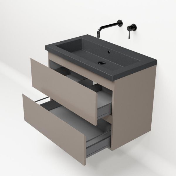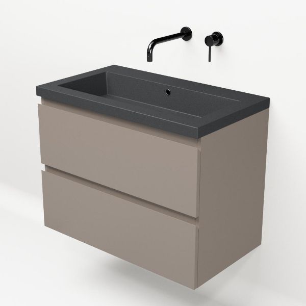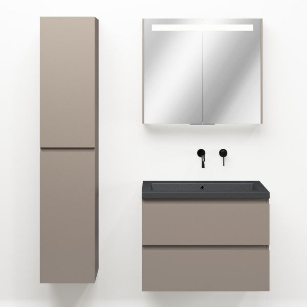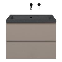 Greeploos badkamermeubel in de kleur taupe is 80 cm breed. De wastafel is vervaardig in quartz en heeft de kleur grijs mat quartz. Dit badkamermeubel met deze wastafel is leverbaar tussen de 60 cm t/m 200 cm