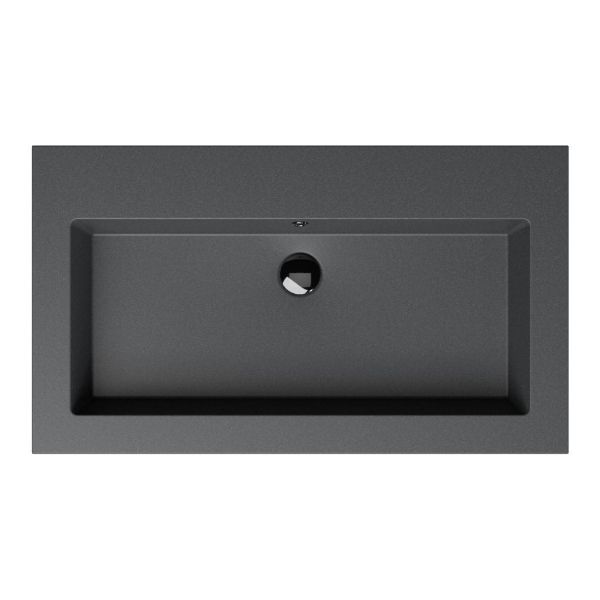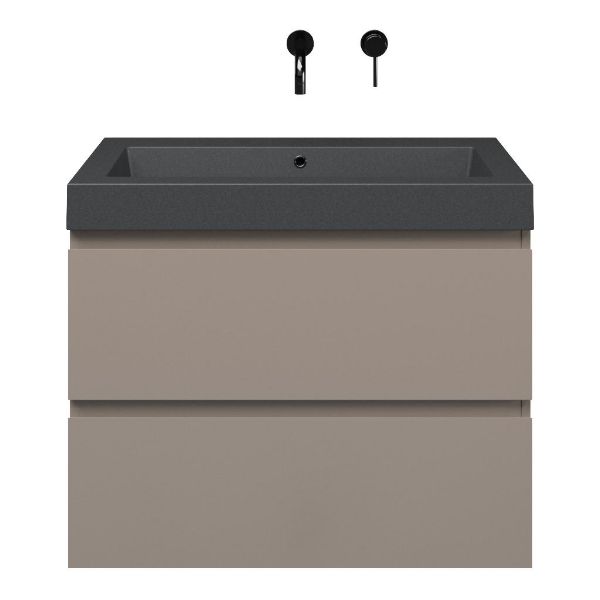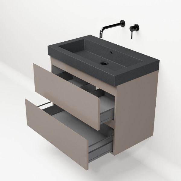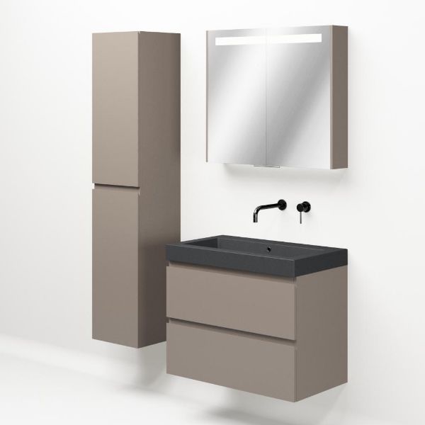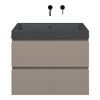 Greeploos badkamermeubel in de kleur taupe is 80 cm breed.  De wastafel is vervaardig in quartz en heeft de kleur grijs mat quartz. Dit badkamermeubel met deze wastafel is leverbaar tussen de 60 cm t/m 200 cm