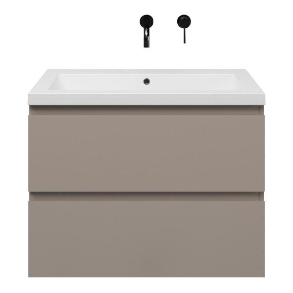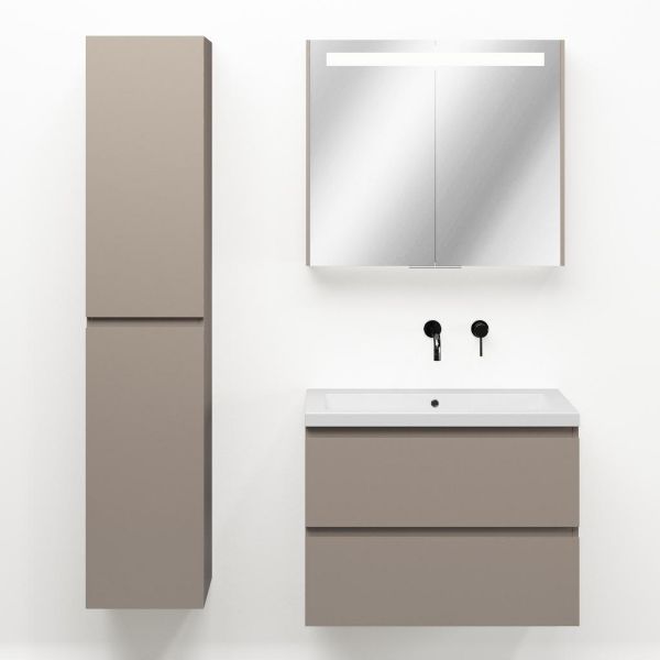 Greeploos badkamermeubel in de kleur taupe is 80 cm breed.  De wastafel is vervaardig in quartz en heeft de kleur wit mat quartz. Dit badkamermeubel met deze wastafel is leverbaar tussen de 60 cm t/m 200 cm