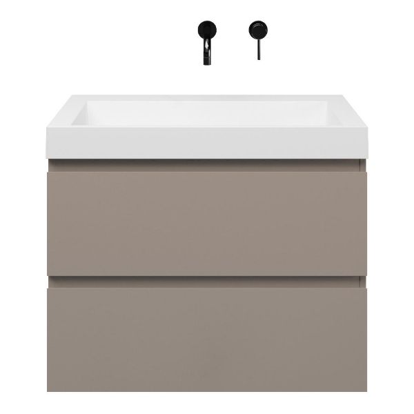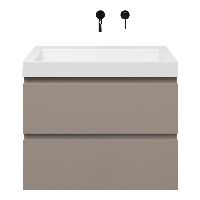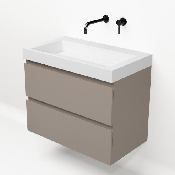 Greeploos badkamermeubel in de kleur taupe is 80 cm breed. De wastafel is vervaardig in polystone en heeft de kleur wit. Dit badkamermeubel met deze wastafel is leverbaar tussen de 60 cm t/m 140 cm