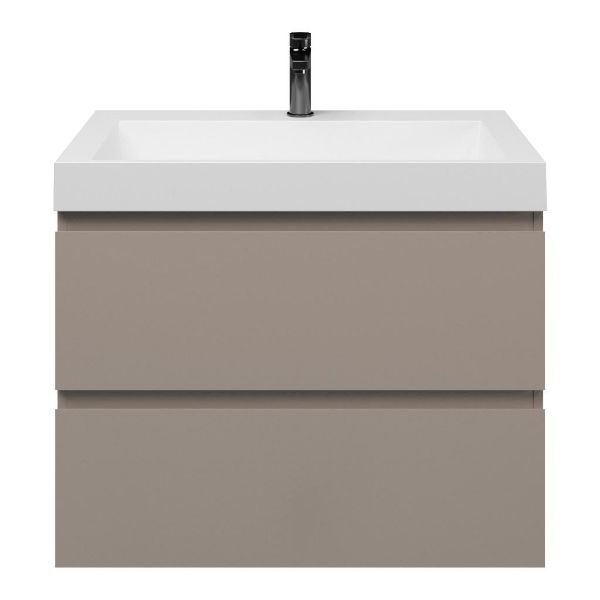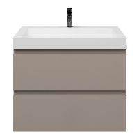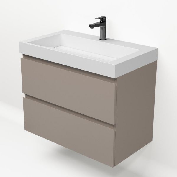 Greeploos badkamermeubel in de kleur taupe is 80 cm breed. De wastafel is vervaardig in quartz en heeft de kleur wit mat keramiek. Dit badkamermeubel met deze wastafel is leverbaar tussen de 60 cm t/m 140 cm