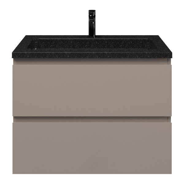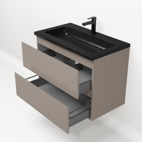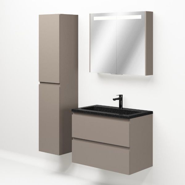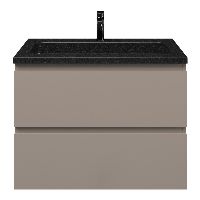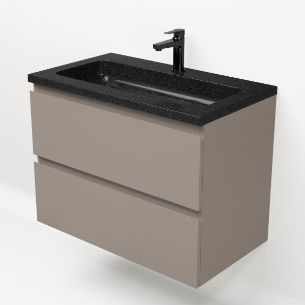 Greeploos badkamermeubel in de kleur taupe is 80 cm breed. De wastafel is vervaardig in natuursteen en heeft de kleur shanxi black. Dit badkamermeubel met deze wastafel is leverbaar tussen de 60 cm t/m 120 cm