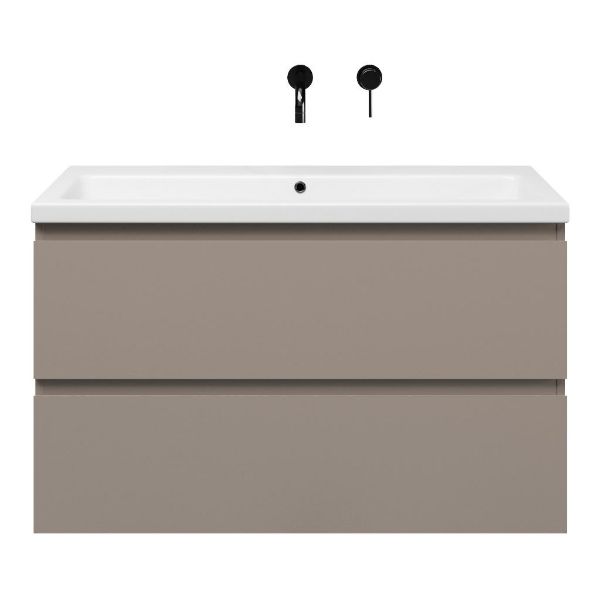 Greeploos badkamermeubel in de kleur taupe is 100 cm breed. De wastafel is vervaardig in keramiek en heeft de kleur wit keramiek. Dit badkamermeubel met deze wastafel is leverbaar tussen de 60 cm t/m 120 cm