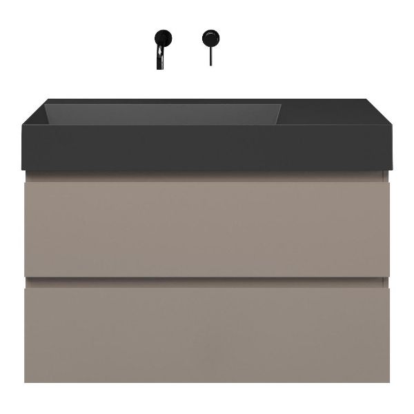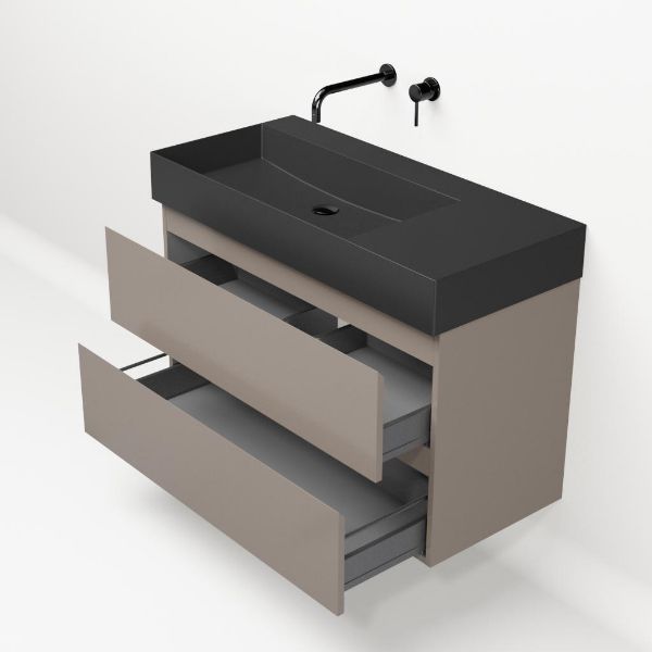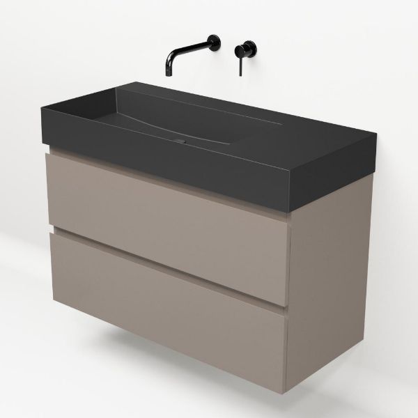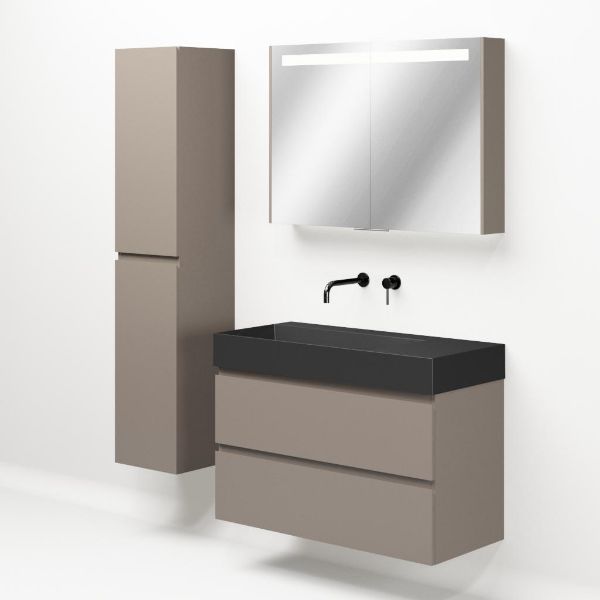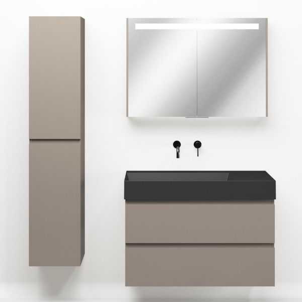 Greeploos badkamermeubel in de kleur taupe is 100 cm breed. De wastafel is vervaardig in keramiek en heeft de kleur antraciet mat keramiek. Dit badkamermeubel met deze wastafel is leverbaar tussen de 60 cm t/m 160 cm