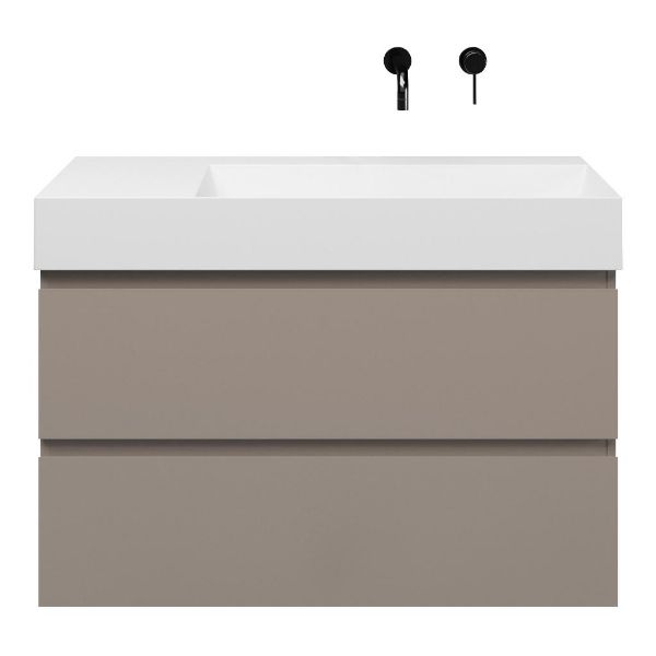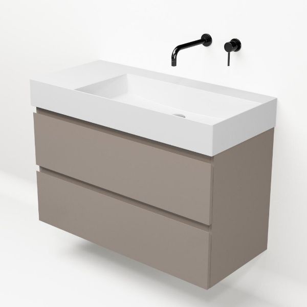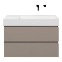 Greeploos badkamermeubel in de kleur taupe is 100 cm breed. De wastafel is vervaardig in keramiek en heeft de kleur wit keramiek. Dit badkamermeubel met deze wastafel is leverbaar tussen de 60 cm t/m 160 cm