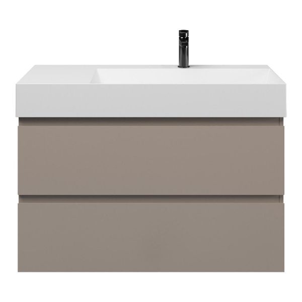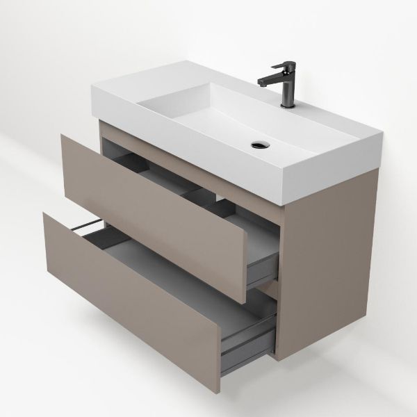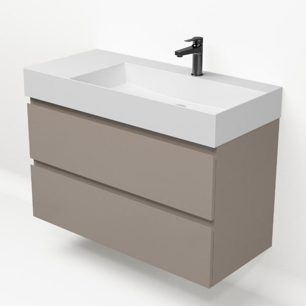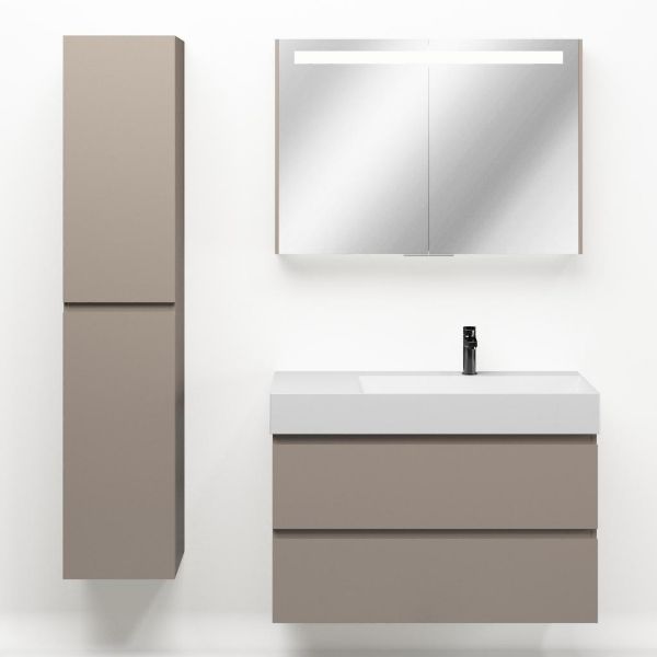 Greeploos badkamermeubel in de kleur taupe is 100 cm breed. De wastafel is vervaardig in keramiek en heeft de kleur wit mat keramiek. Dit badkamermeubel met deze wastafel is leverbaar tussen de 60 cm t/m 160 cm
