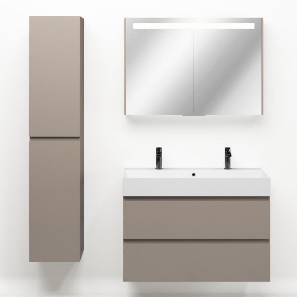 Greeploos badkamermeubel in de kleur taupe is 100 cm breed. De wastafel is vervaardig in keramiek en heeft de kleur wit keramiek. Dit badkamermeubel met deze wastafel is leverbaar tussen de 60 cm t/m 160 cm