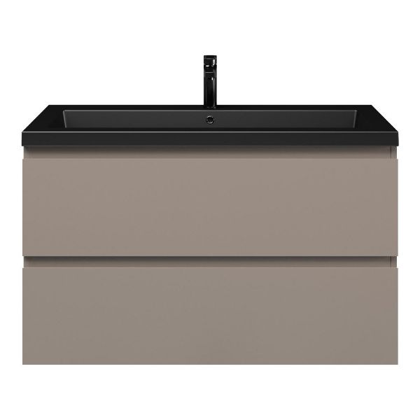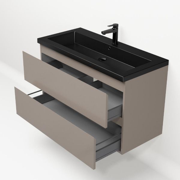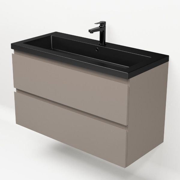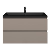 Greeploos badkamermeubel in de kleur taupe is 100 cm breed. De wastafel is vervaardig in polystone en heeft de kleur zwart mat keramiek. Dit badkamermeubel met deze wastafel is leverbaar tussen de 60 cm t/m 200 cm