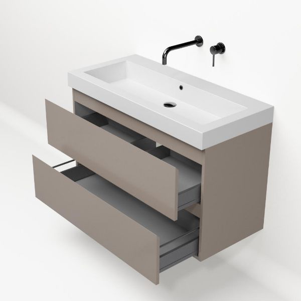 Greeploos badkamermeubel in de kleur taupe is 100 cm breed. De wastafel is vervaardig in quartz en heeft de kleur wit mat quartz. Dit badkamermeubel met deze wastafel is leverbaar tussen de 60 cm t/m 200 cm