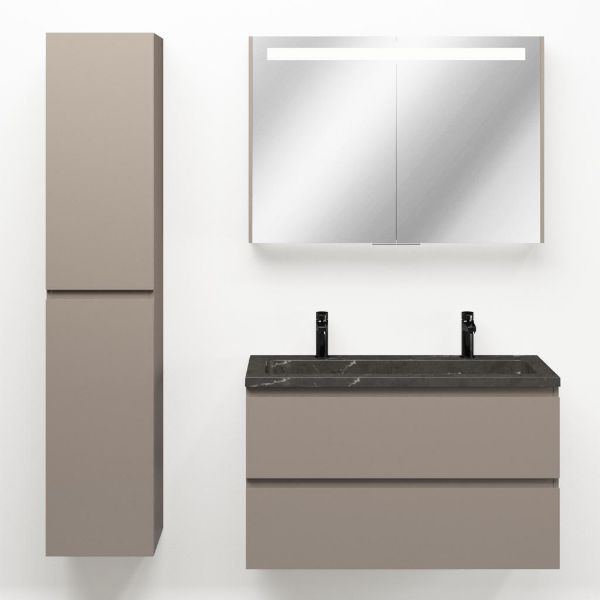 Greeploos badkamermeubel in de kleur taupe is 100 cm breed. De wastafel is vervaardig in natuursteen en heeft de kleur blue stone. Dit badkamermeubel met deze wastafel is leverbaar tussen de 60 cm t/m 120 cm