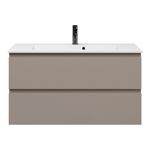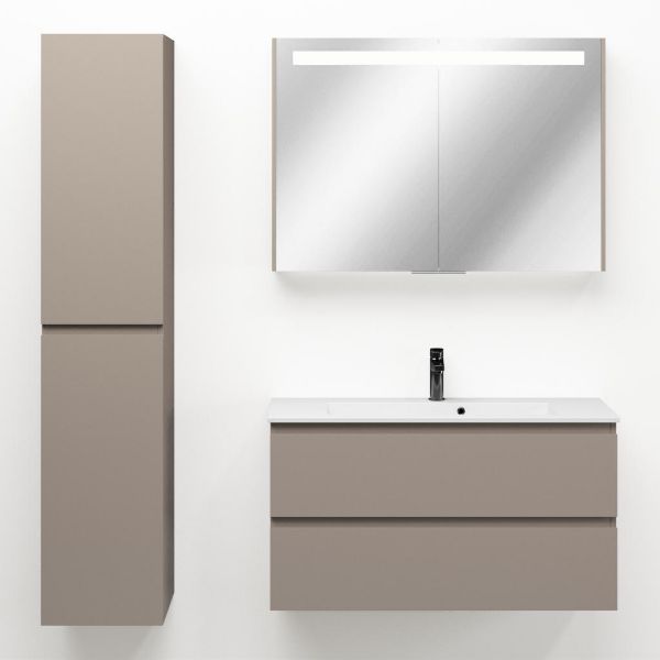 Ondiepe greeploos badkamermeubel in de kleur taupe. Badmeubel is praktisch voor een compact badkamer. Het meubel van 100 cm breed is er. De wastafel is vervaardig in keramiek en heeft de kleur wit keramiek. Dit badkamermeubel met deze wastafel is leverbaar tussen de 60 cm t/m 100 cm.