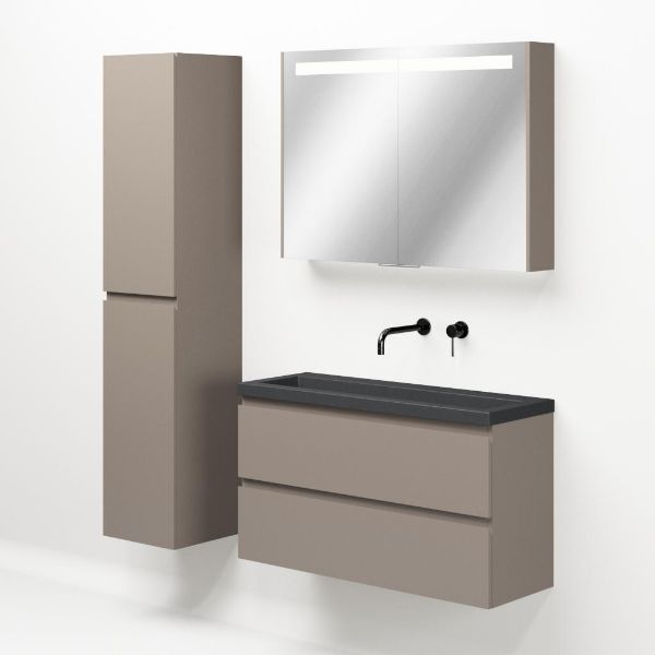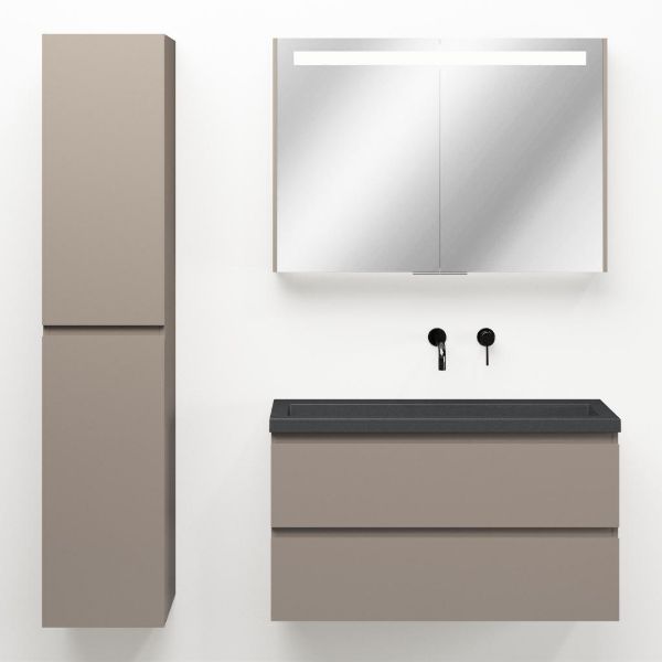 Ondiepe greeploos badkamermeubel in de kleur taupe. Badmeubel is praktisch voor een compact badkamer. Het meubel van 100 cm breed is er. De wastafel is vervaardig in quartz en heeft de kleur grijs mat quartz. Dit badkamermeubel met deze wastafel is leverbaar tussen de 60 cm t/m 120 cm.