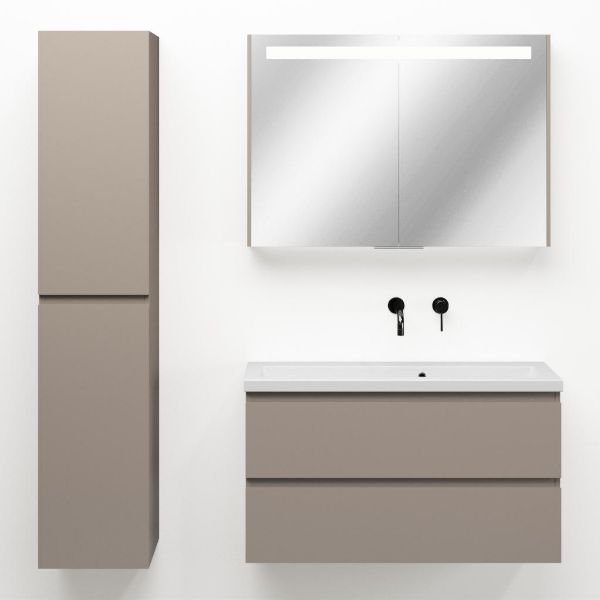 Ondiepe greeploos badkamermeubel in de kleur taupe. Badmeubel is praktisch voor een compact badkamer. Het meubel van 100 cm breed is er. De wastafel is vervaardig in keramiek en heeft de kleur wit mat keramiek. Dit badkamermeubel met deze wastafel is leverbaar tussen de 60 cm t/m 120 cm.