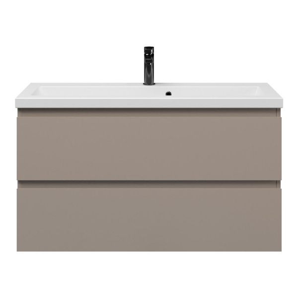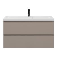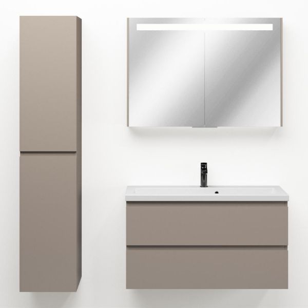 Ondiepe greeploos badkamermeubel in de kleur taupe. Badmeubel is praktisch voor een compact badkamer. Het meubel van 100 cm breed is er. De wastafel is vervaardig in keramiek en heeft de kleur wit mat keramiek. Dit badkamermeubel met deze wastafel is leverbaar tussen de 60 cm t/m 120 cm.