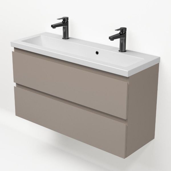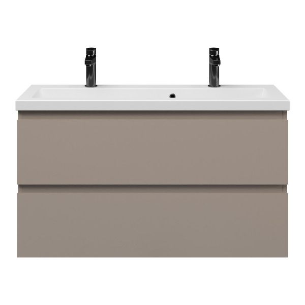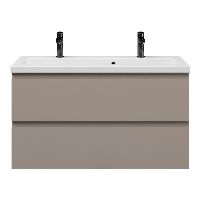 | Bellanti Secca/Amelia ondiep badmeubel 100x36 2 softclose laden taupe greeploos keramische wastafel mat wit met 2 kraangaten |