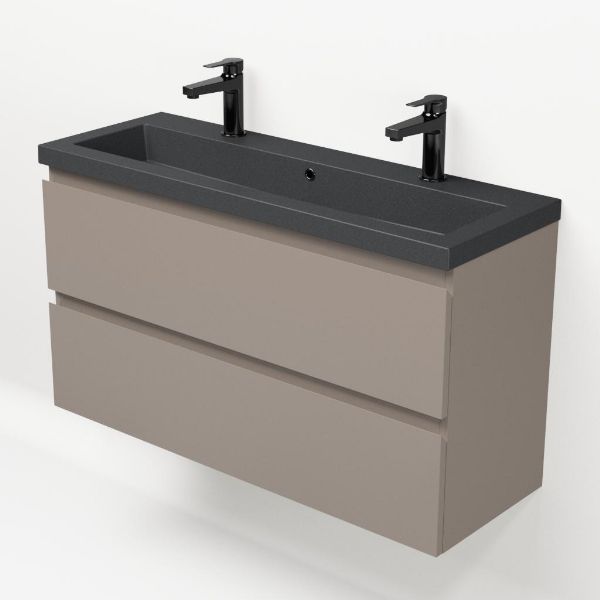 | Bellanti Secca/Esta-Q ondiep badmeubel 100x36 2 softclose laden taupe greeploos met quartz wastafel mat grijs met 2 kraangaten met overloop |