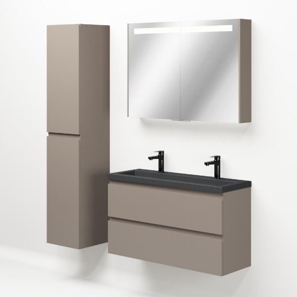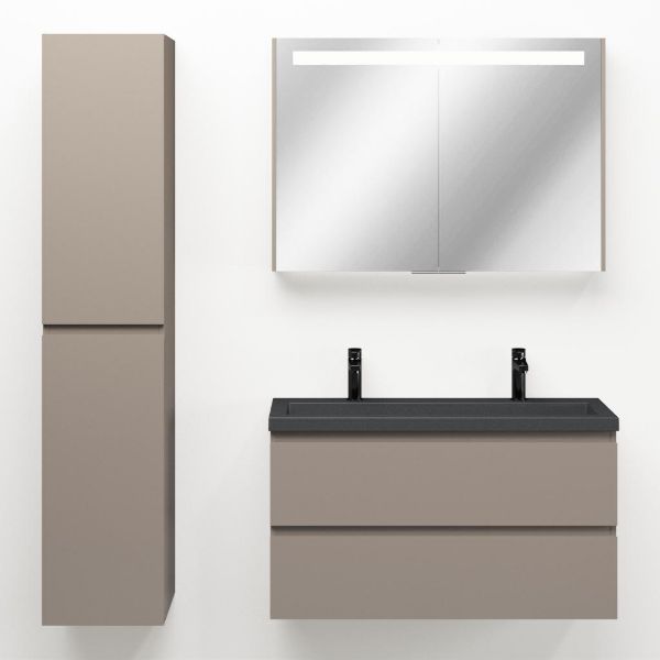 Ondiepe greeploos badkamermeubel in de kleur taupe. Badmeubel is praktisch voor een compact badkamer. Het meubel van 100 cm breed is er. De wastafel is vervaardig in quartz en heeft de kleur grijs mat quartz. Dit badkamermeubel met deze wastafel is leverbaar tussen de 60 cm t/m 120 cm.